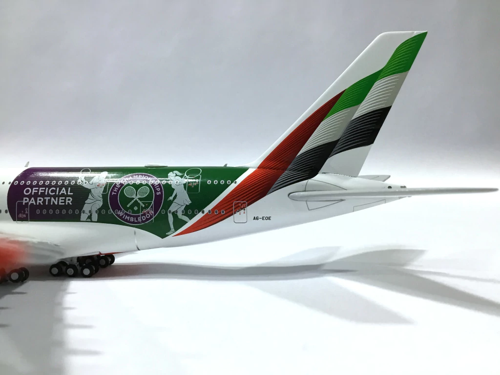 Esta impresionante maqueta es un homenaje a la colaboración de Emirates con el prestigioso torneo de tenis Wimbledon, reflejando la elegancia y el espíritu deportivo del torneo.